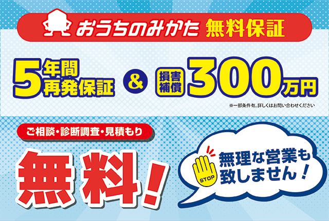 万が一のしろあり発生時は無償にて再施工。更なる安心をご希望の方には最大1000万の損保会社の建物修復保証もご用意しております。お気軽にご相談下さい。