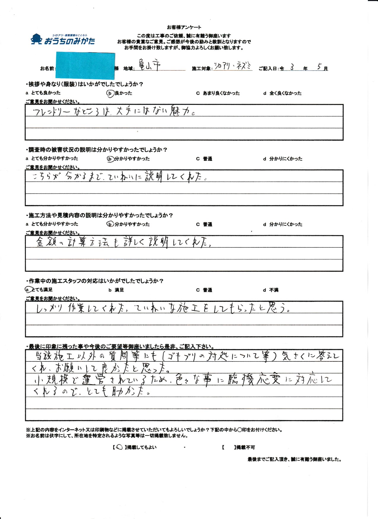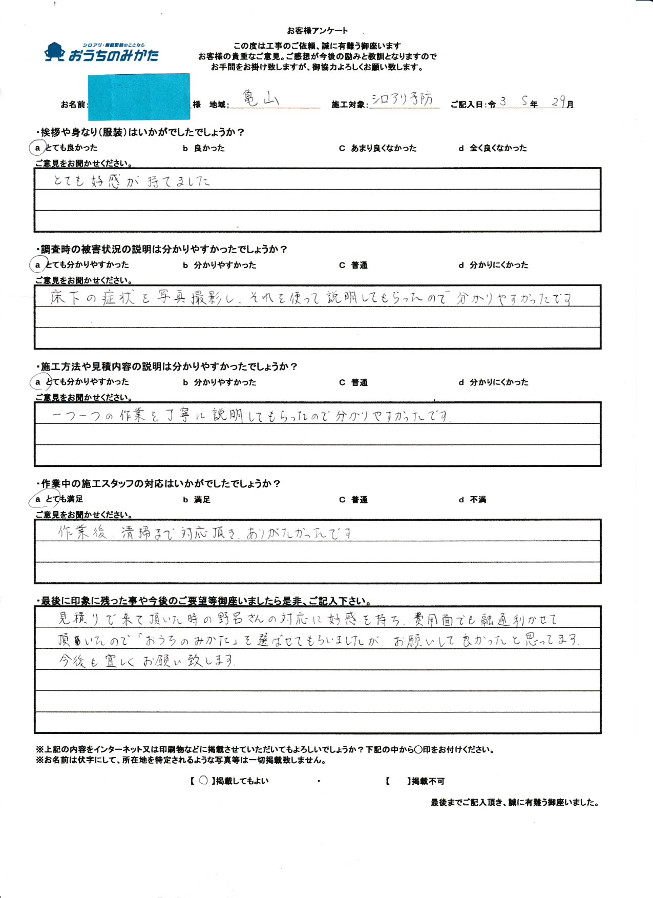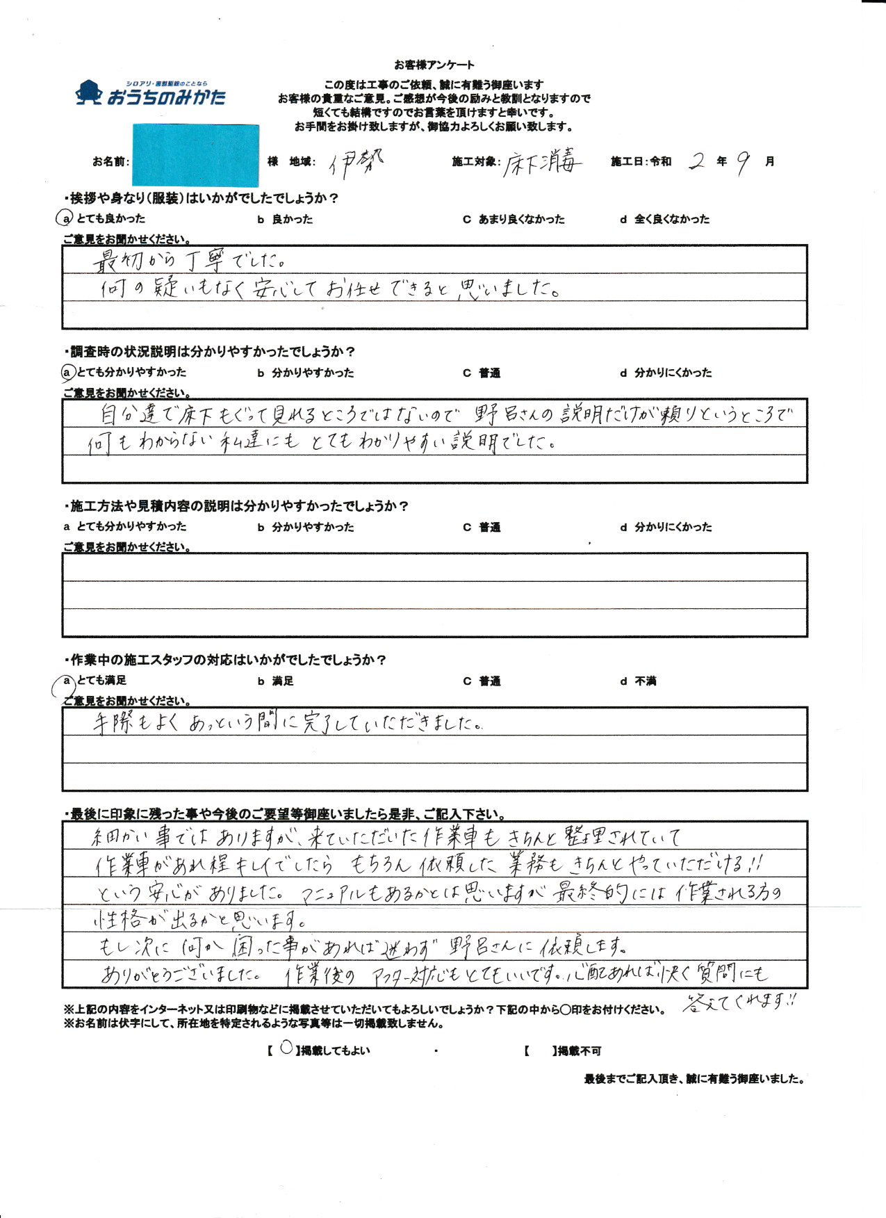 私共の仕事は残念ですが、まだまだ不透明な部分が多い仕事で御座います。ですので、私自身が顔を出して、このようにお客様の声を載せる事が少しでも安心に繋がる事と思っております。にも関わらず私の油断から来る事でアンケートに記載ある内容にて御迷惑をお掛けした事改めてお詫び申し上げます。最後に5年後も頼みたいというお言葉がお客様からチャンスを頂いたと思って次回お伺い時には、先の事が無いように致します。この度は貴重なご意見、本当に有難う御座いました。
