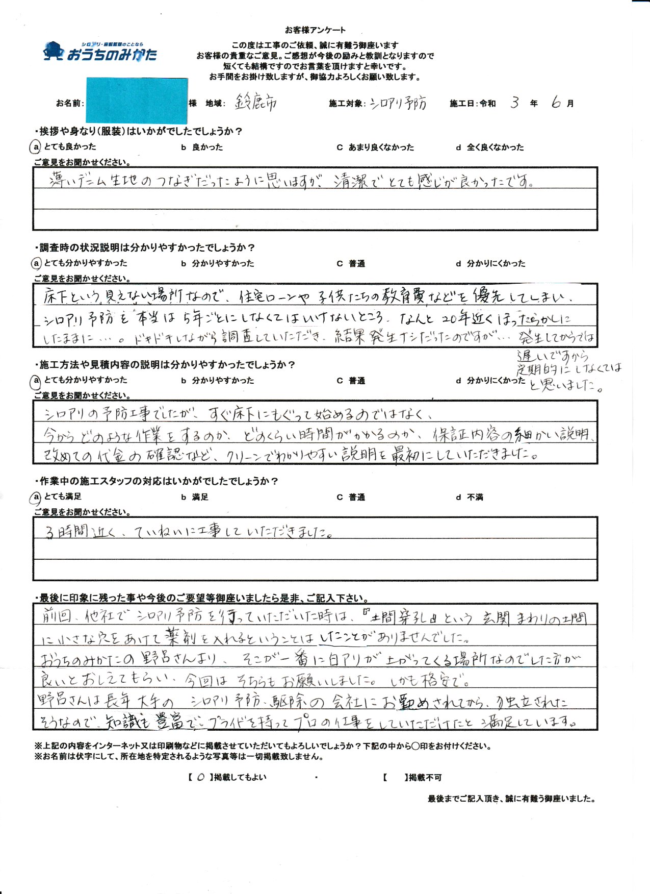 この度は数ある業者の中よりシロアリ予防工事のご用命を頂き誠に有難う御座いました。私自身話す事は大好きですが、まだまだお客様に作業内容や薬剤の安全性や効果を言葉にして分かりやすく説明できていないと思いますが、その事をこのように評価頂けた事は大変嬉しく思います。私達の仕事は ”形に残らない” ”作業が見えない事が多い” ”悪徳業者がいる” ”決してお安くはない” 等が大半のお客様が抱いておられるイメージだと思います。そんな中、自分を信じて工事をご用命頂くにはしっかりとした説明が先ずは一番と思っております。今後もより一層お客様には安心して気持ちよくご依頼いただけますよう精進して参ります。次回の中間点検以外でも何か気になる事が御座いましたら遠慮なくお申し付け下さいませ。改めて今後共宜しくお願い致します。