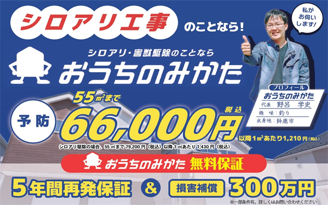 万が一のしろあり発生時は無償にて再施工。更なる安心をご希望の方には最大1000万の損保会社の建物修復保証もご用意しております。お気軽にご相談下さい。