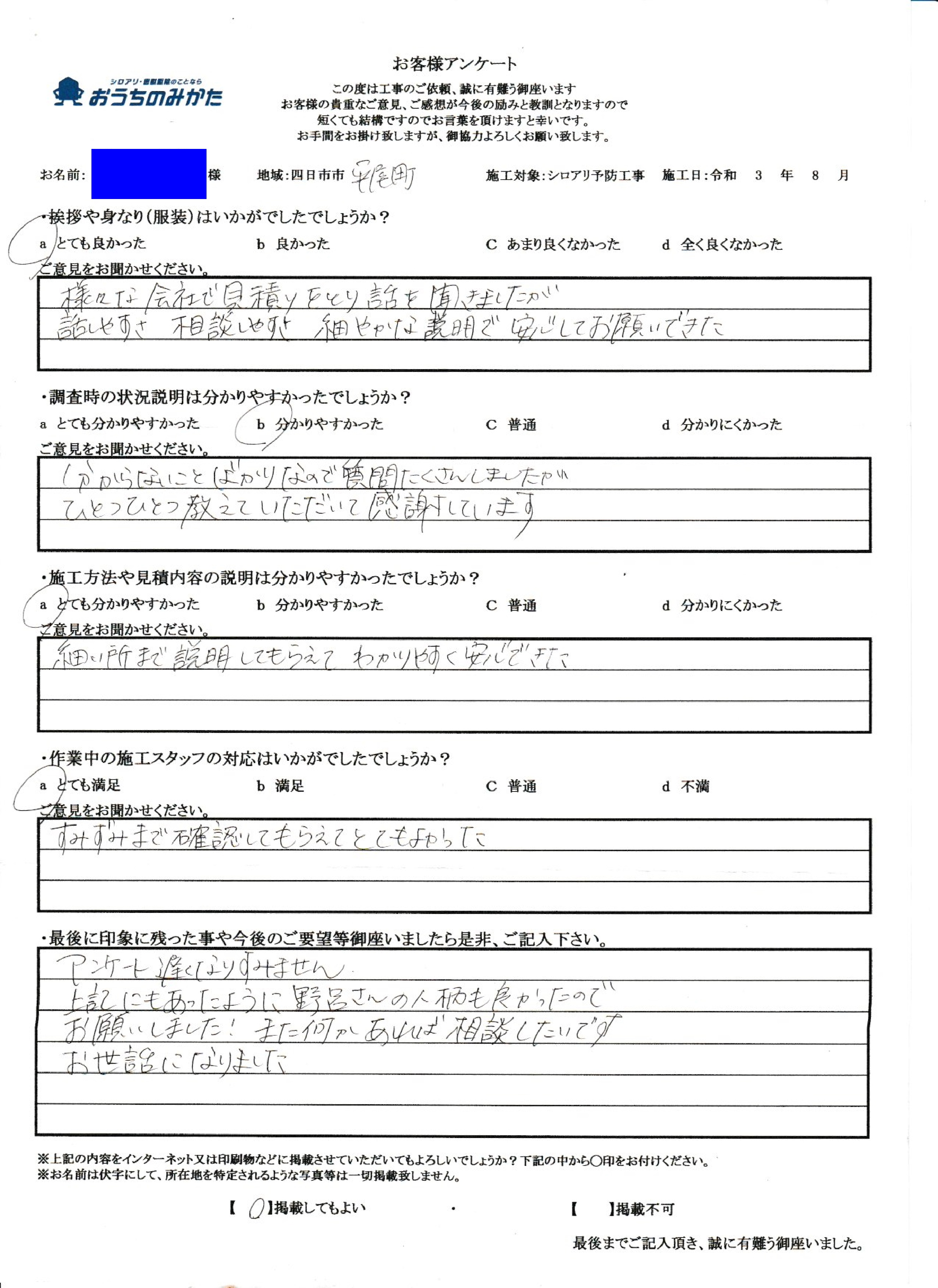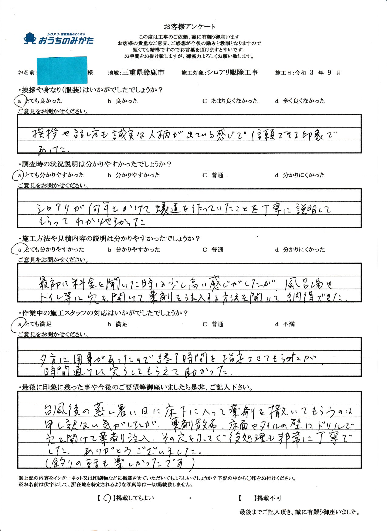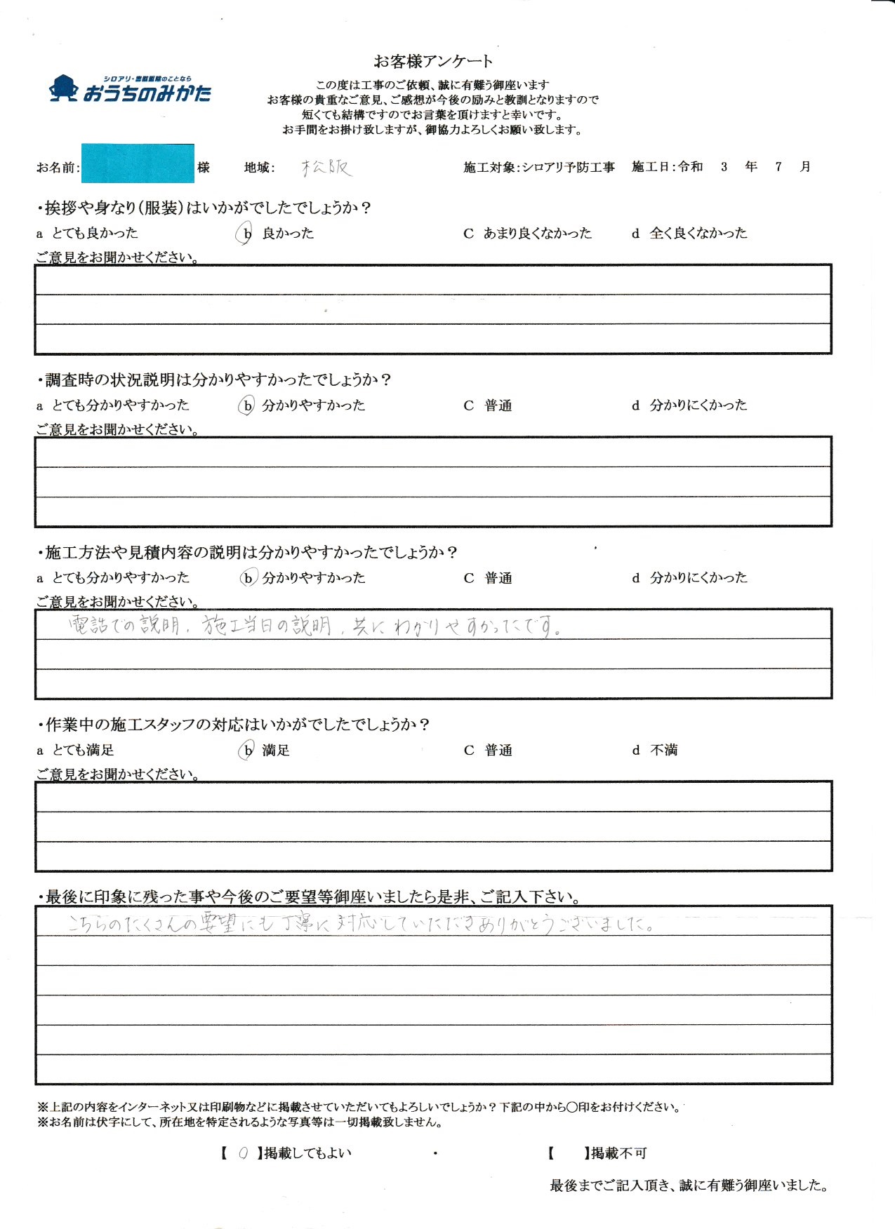 私共の仕事は残念ですが、まだまだ不透明な部分が多い仕事で御座います。ですので、私自身が顔を出して、このようにお客様の声を載せる事が少しでも安心に繋がる事と思っております。にも関わらず私の油断から来る事でアンケートに記載ある内容にて御迷惑をお掛けした事改めてお詫び申し上げます。最後に5年後も頼みたいというお言葉がお客様からチャンスを頂いたと思って次回お伺い時には、先の事が無いように致します。この度は貴重なご意見、本当に有難う御座いました。