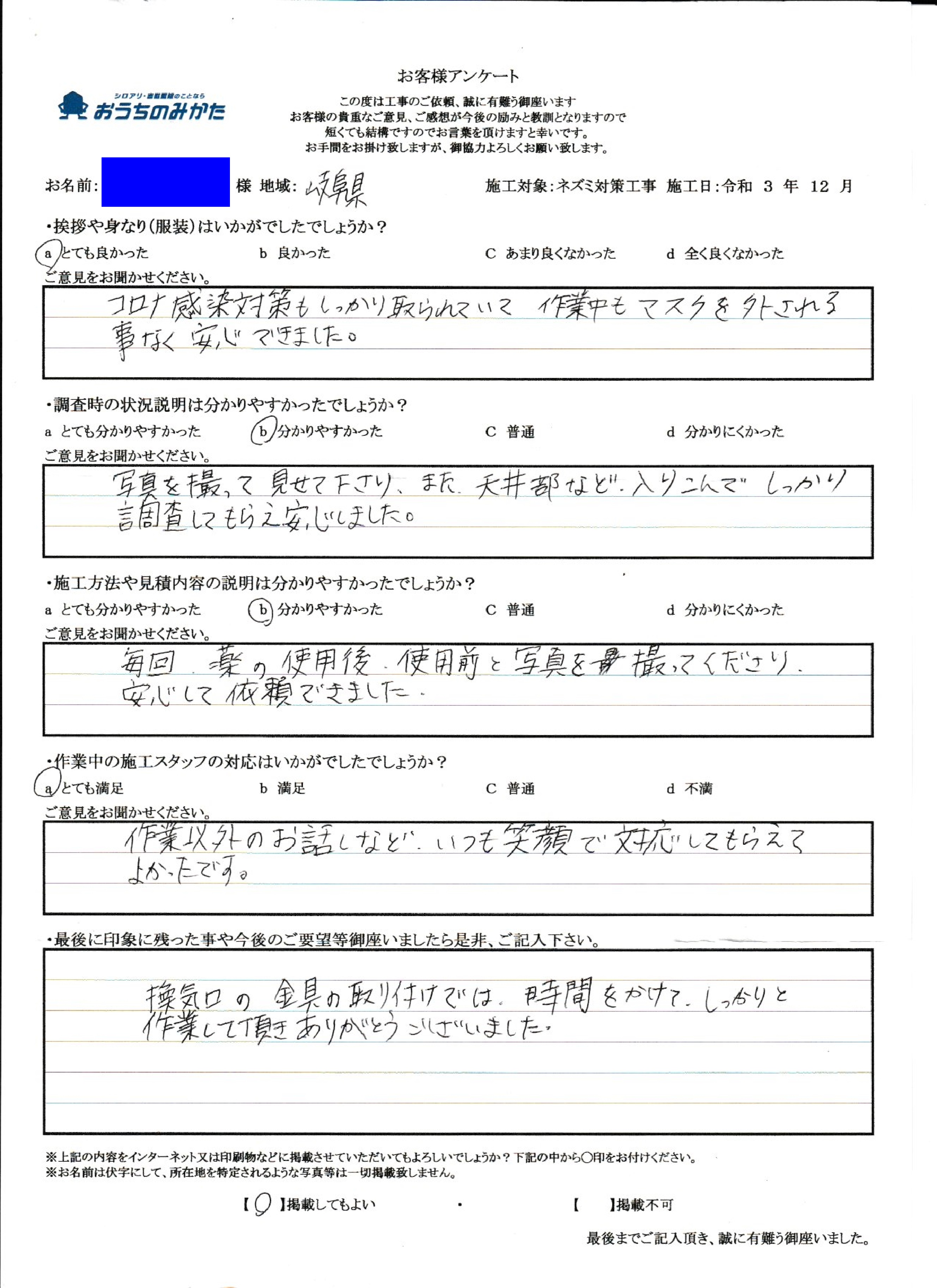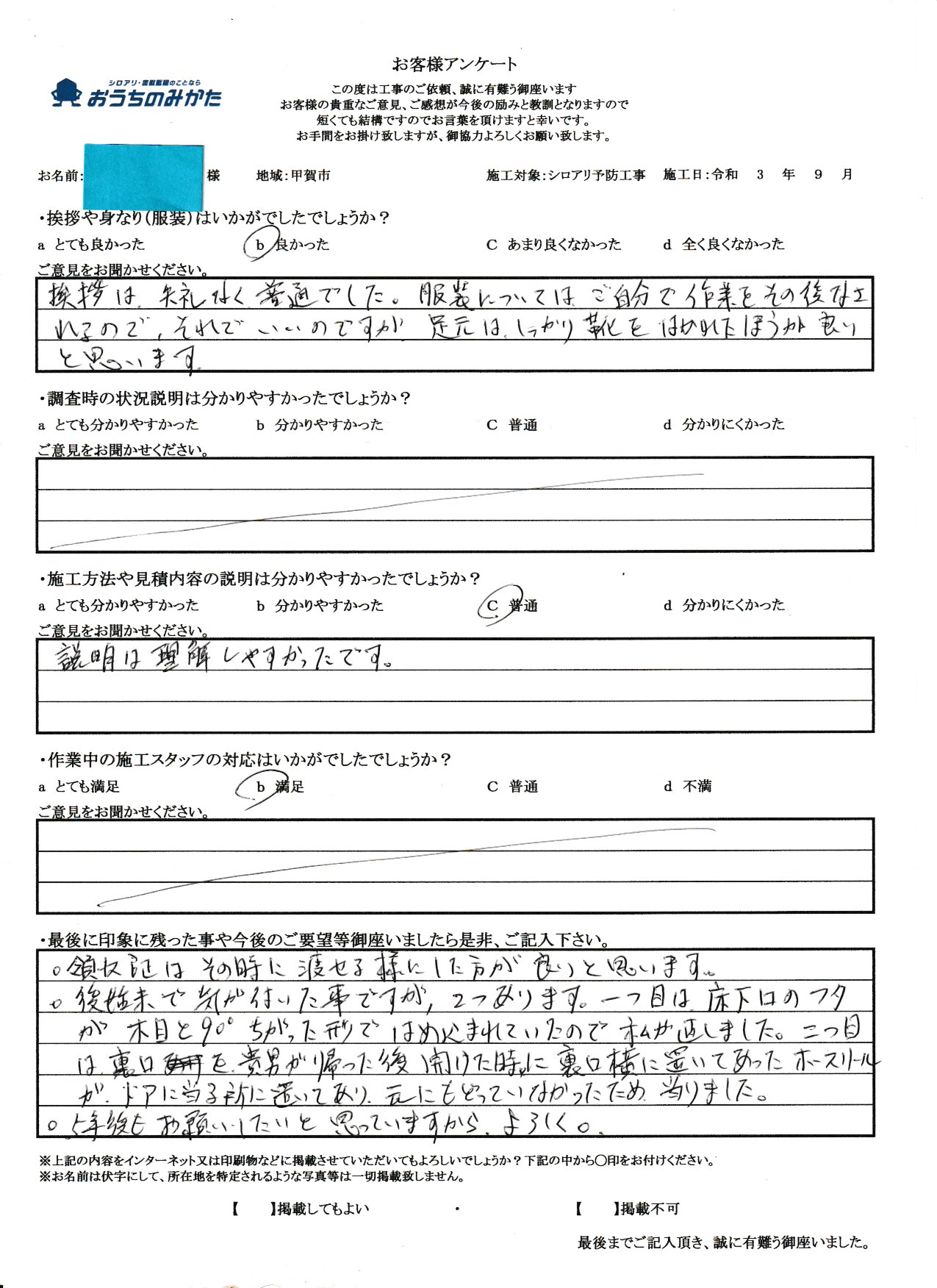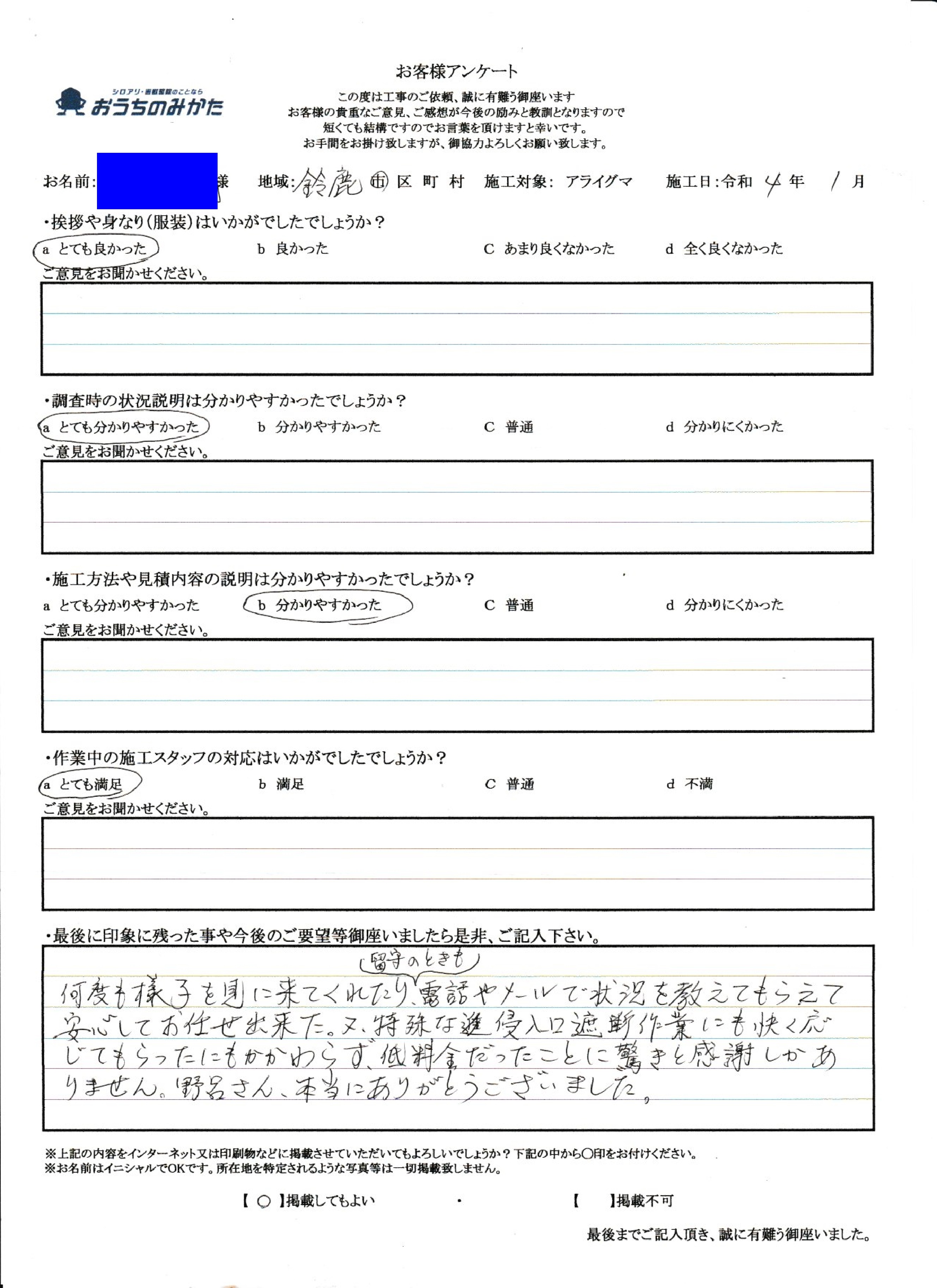 私共の仕事は残念ですが、まだまだ不透明な部分が多い仕事で御座います。ですので、私自身が顔を出して、このようにお客様の声を載せる事が少しでも安心に繋がる事と思っております。にも関わらず私の油断から来る事でアンケートに記載ある内容にて御迷惑をお掛けした事改めてお詫び申し上げます。最後に5年後も頼みたいというお言葉がお客様からチャンスを頂いたと思って次回お伺い時には、先の事が無いように致します。この度は貴重なご意見、本当に有難う御座いました。
